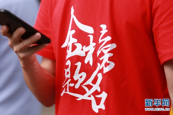 7月8日下午,昆一中考点外,一位家长穿着印有“金榜题名”的衣服来接考生。