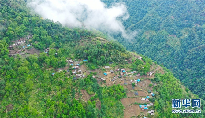 阿地马底,傈僳语,意为“没有一块平地的地方”。地如其名,这个高山峡谷深处的村寨,地势险峻、贫困闭塞,一方水土养不起一方人。图为航拍阿地马底村民小组(5月13日摄)。