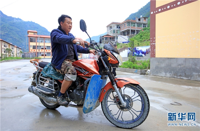 山上山高坡陡,走路都费劲,搬下山后,余友邓和不少村民一样,买了摩托车,出行方便了很多(5月14日摄)。