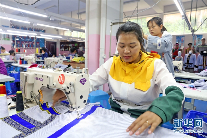 搬得出,还要稳得住、能致富。阿路底安置点通过设置公岗、引进扶贫车间、组织外出务工等一系列举措,在“能发展”上下功夫。目前,扶持各类公岗就业117人,组织务工163人,还扶持村民发展草果、茶叶、黄精果、中华蜂等种植和养殖业。图为搬迁户在安置点扶贫车间内工作(5月14日摄)。
