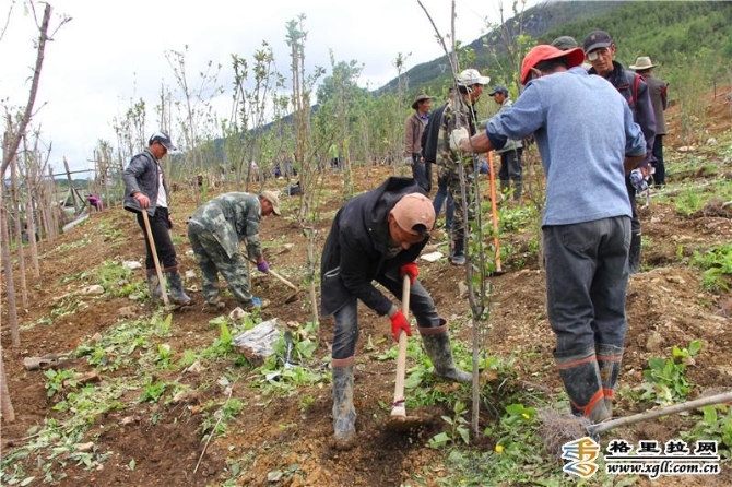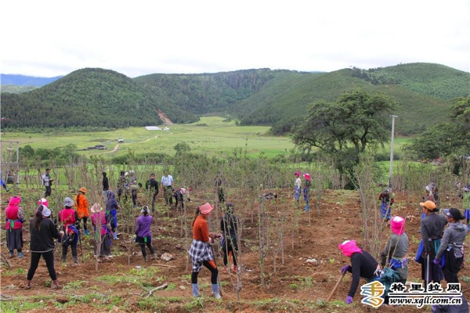 7月8日,香格里拉市小中甸镇和平村基公村民小组一片热闹景象,面积23亩的荒坡上,全组72名党员群众正热火朝天地将州林业和草原局免费提供的2000余株樱花和海棠苗木植入土地,为荒坡穿上绿衣。