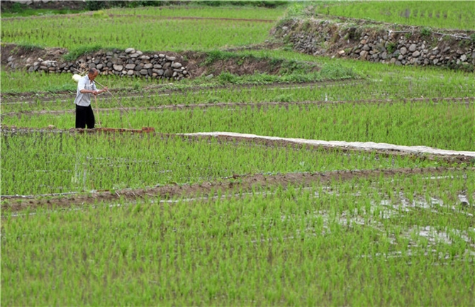 一名村民在田铺大塆的稻田中劳作(6月12日摄)。新华社记者 李嘉南 摄