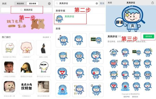 微信表情商店搜索“真真辟谣”,进入表情专辑,点击“使用表情”,即可使用。