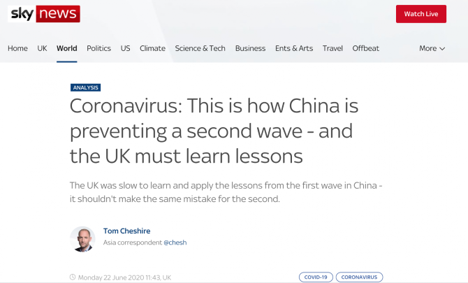 在英国天空新闻网站22日发表的文章《中国是这样防止第二拨疫情的——英国必须学习经验》中,记者讲述了自己的亲身经历: