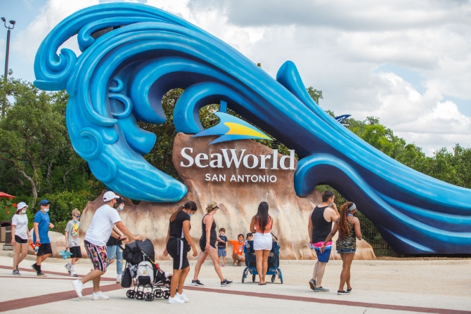 6月19日,位于美国得克萨斯州圣安东尼奥市的海洋世界主题公园重新开放。公园要求游客必须戴口罩,并保持2米的社交距离。新华社发(马烈摄)