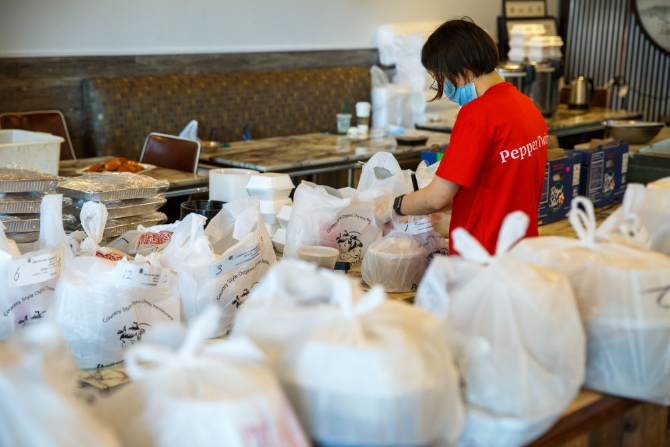 7月3日,店员在美国休斯敦的一家中餐馆分装外卖。新华社发(马烈摄)