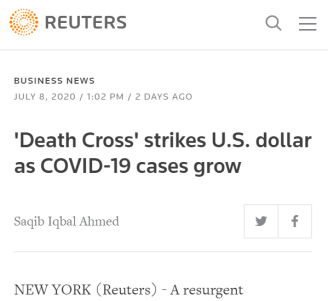 路透社称,美元指数日前已较近期高点下跌6%,而期货市场上的美元净空仓规模接近2018年以来的最高点。根据美国银行全球研究部分析师团队的研究,美元此前的跌势引发了被称为“死亡交叉”的技术形态,即50日移动均线跌破200日移动均线。该行分析师称,1980年以来,九次出现“死亡交叉”后,美元有八次进入疲软期。