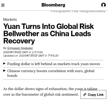 彭博社称,随着美元呈现疲态,人民币已有成为全球风险情绪“晴雨表”的势头。目前,全球股票、债券和大宗商品的涨势正与美元脱钩,全球资产上涨和人民币升值的紧密关系背后,是投资者越来越乐观地认为,中国将带领全球走出疫情导致的经济衰退。因此,美联储等全球主要央行释放的大量流动性正涌向人民币资产,以及其他与中国有密切联系的市场。