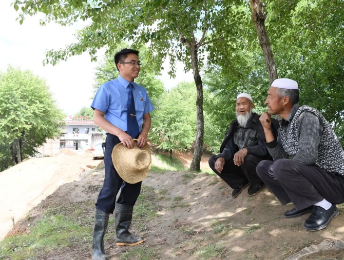 甘肃省东乡族自治县检察院帮扶干警与关卜岭村群众交流产业发展情况并开展普法宣传工作。