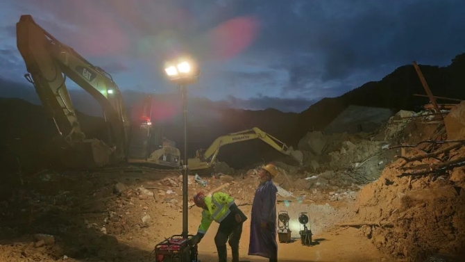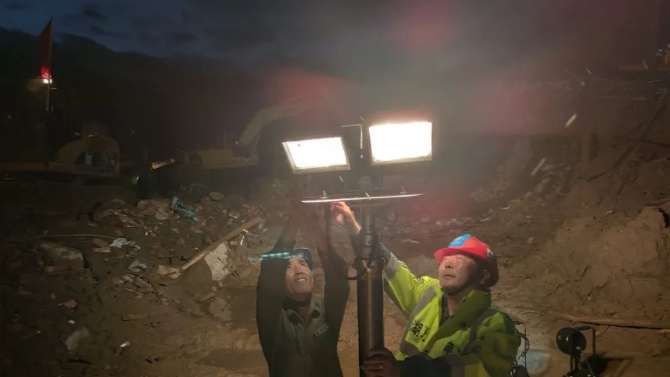 应急发电车照明范围有限,需要配合救援需求适当移动。33名抢险队员早已浑身湿透,在一片泥泞中继续坚守,时刻保障现场照明用电。