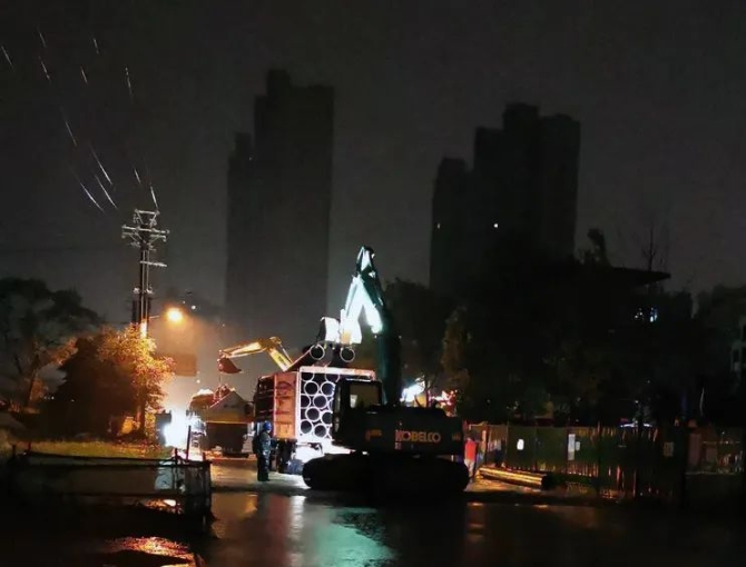 连续一周的强降雨致使城区港道积水,市民出行受阻,中国能建南方建设武穴项目部安排5台挖机、15名施工人员配合市防汛指挥部安装临时PE管,通过增压泵将城区内积水逐步排出。经过两天两夜的坚守,7月9日,横贯城区、长江的排涝PE管安装完毕,城区内积水得以缓解。