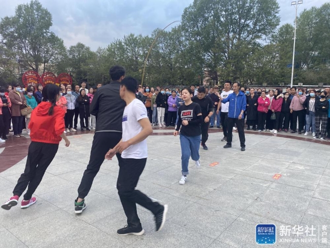 在青海省海北藏族自治州海晏县西海镇文化广场,当地群众在举行跳绳比赛(7月6日手机拍摄)。新华社记者 张子琪 摄