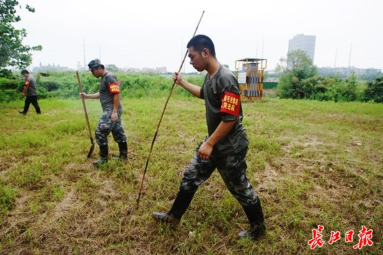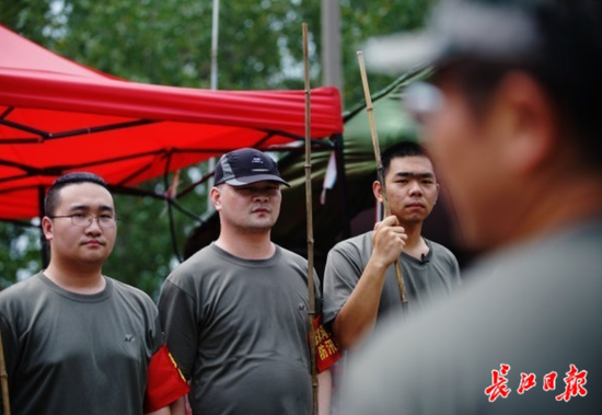 11日下午,武汉武金堤张家湾街驻守堤段,8名青年突击队队员手拿长竿站成一排,正准备出发巡堤。
