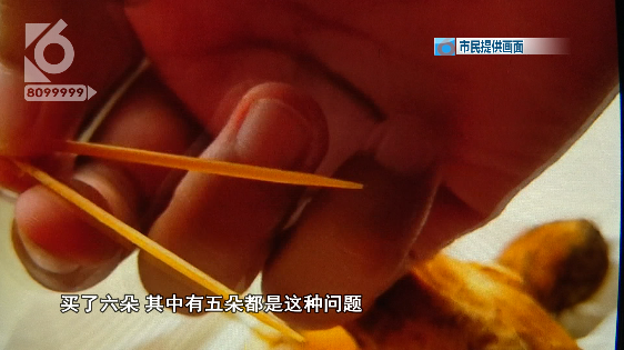 周先生:“菌子不新鲜,然后被小贩,用牙签,把菌根和菌伞,连接在一起,买了六朵,其中有五朵都是这种问题,拿回去只有一朵是自然连接的,菌头没有掉,其它五朵都是人为拼接的。”