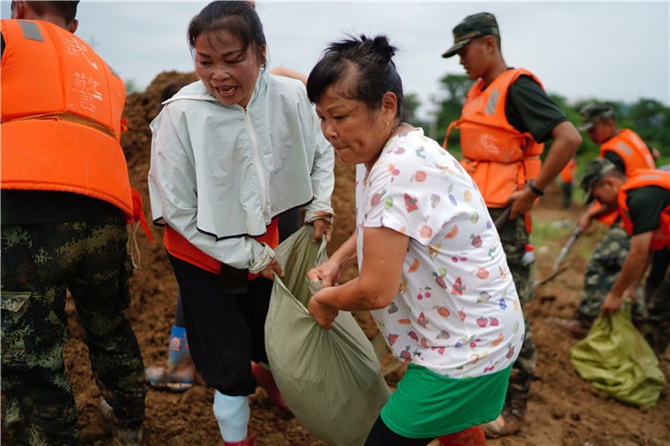 村民余风英是这支“阿姨团”的队长,“我们之前都是一起跳广场舞的‘舞友’,洪水来了,看到这么多救援人员来帮我们修圩堤,我们也要尽一份自己的力量。”