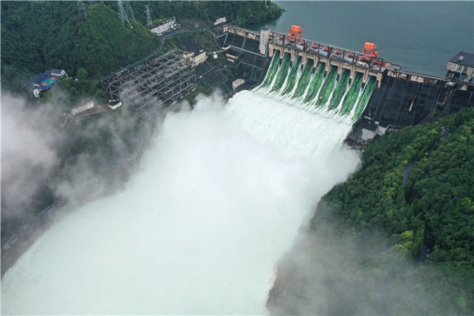 7月8日开启9孔泄洪的新安江水库(无人机照片)。新华社记者 翁忻旸 摄