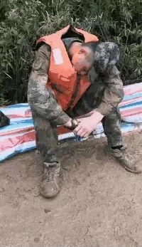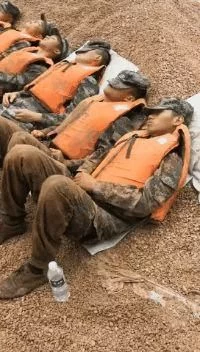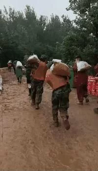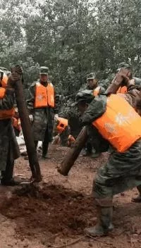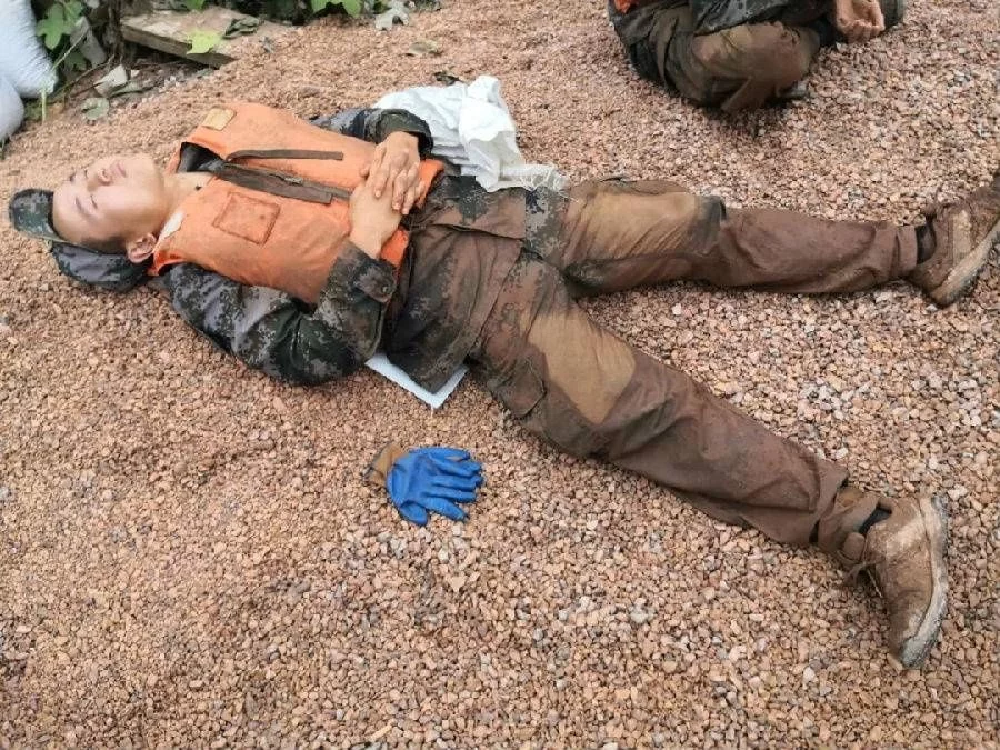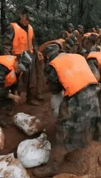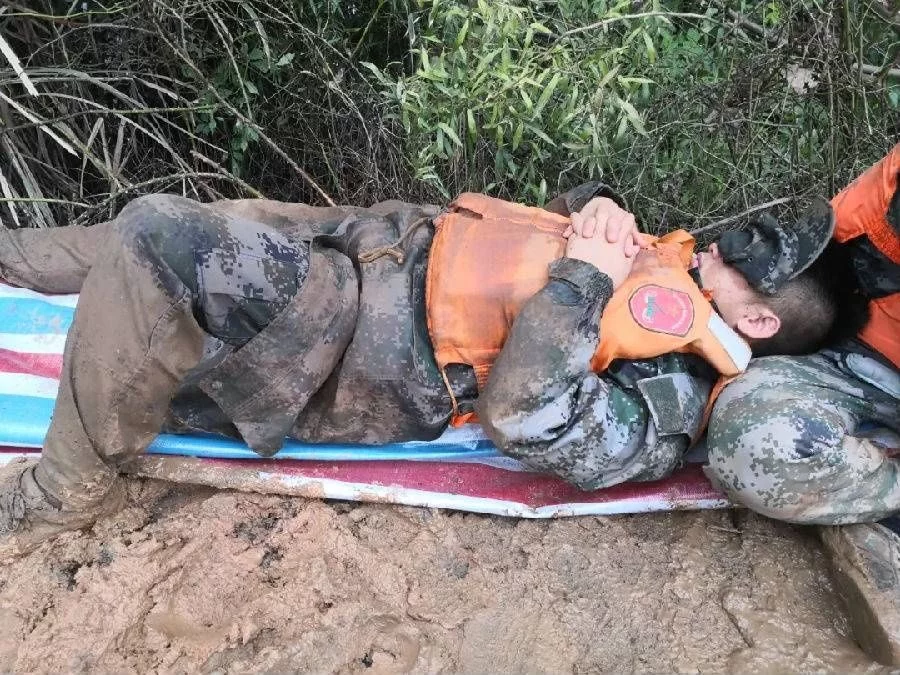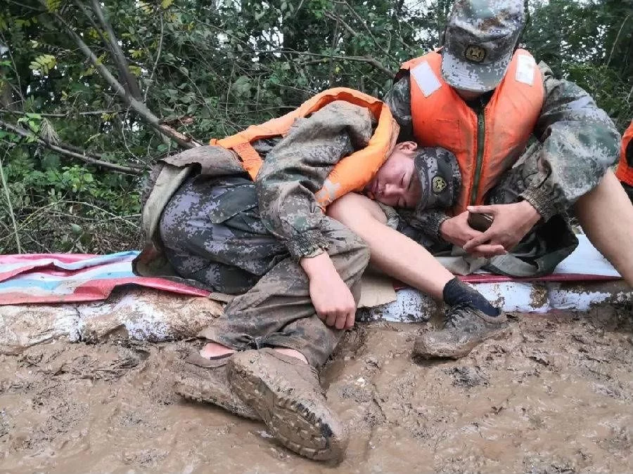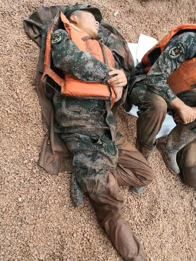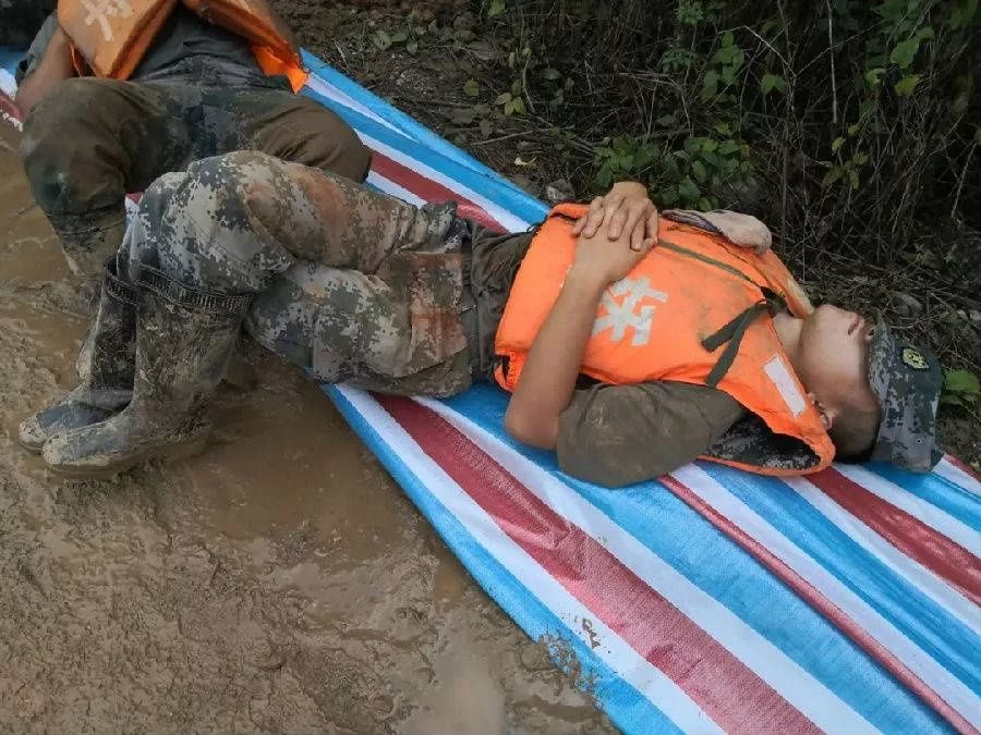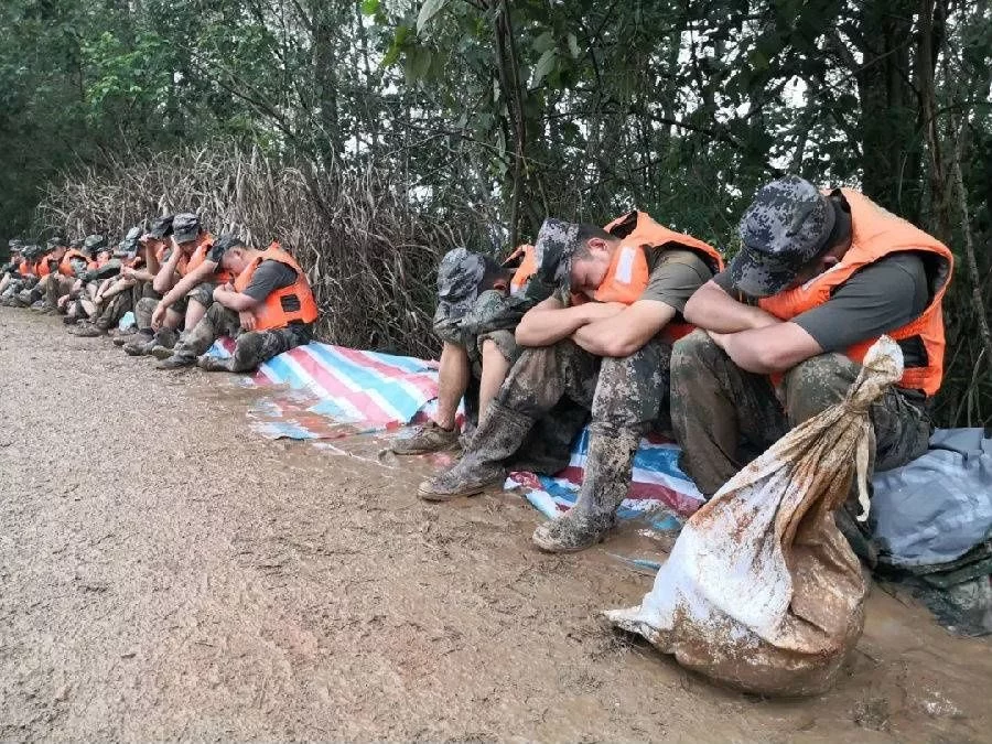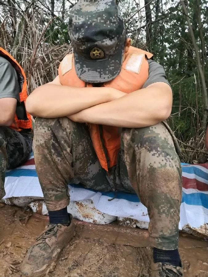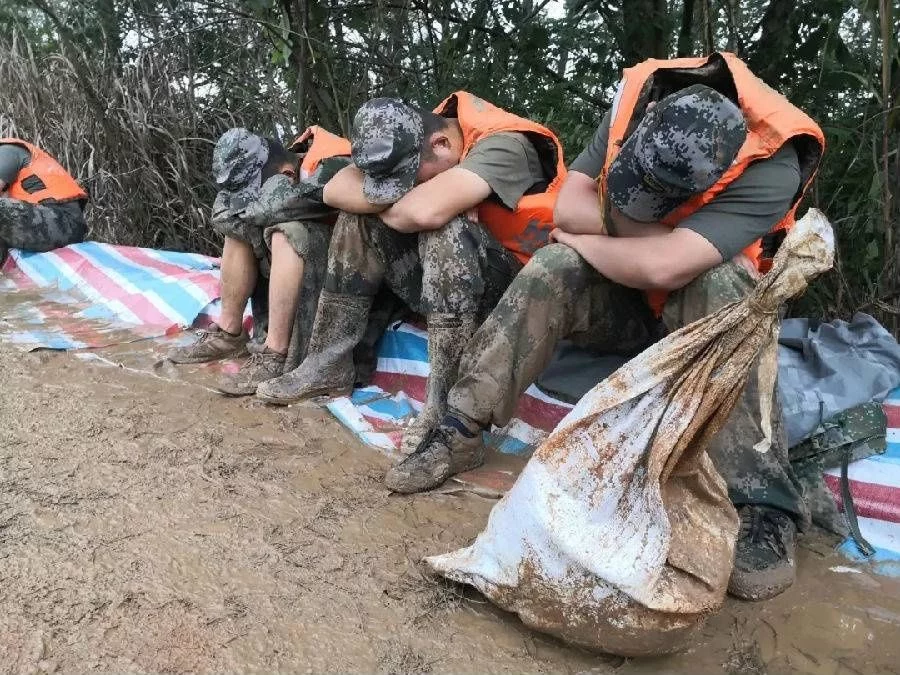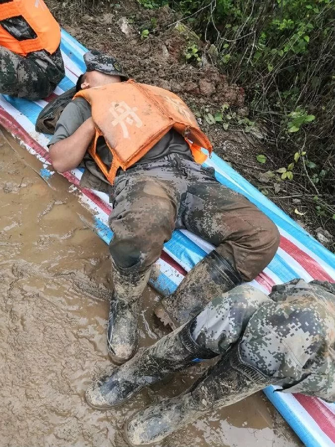 7月13日中午,湖北省武穴市金牛湖民堤上,刚处理完险情的中部战区陆军某舟桥旅官兵满身泥水,在大堤上短暂休息。