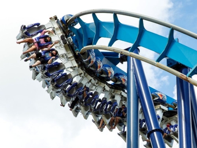 6月19日,在美国圣安东尼奥市的海洋世界主题公园,人们戴着口罩坐过山车。新华社发(马烈摄)