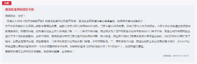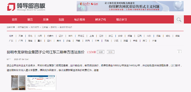 近日,有网友在人民网开设的领导留言板上反映昆明市龙泉物业集团子公司江东二期单方违法涨价。对此,盘龙区金辰街道办事处做出答复:维持原价,不涨停车费。
