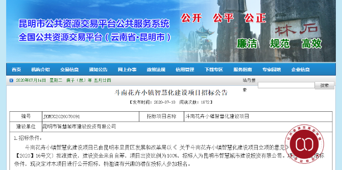 近日,昆明市公共资源交易平台发布《斗南花卉小镇智慧化建设项目招标公告》,昆明拟投资2152.54万元进行斗南花卉小镇智慧化建设。项目预计工期4个月,计划开工时间为8月10日,计划竣工时间12月10日。