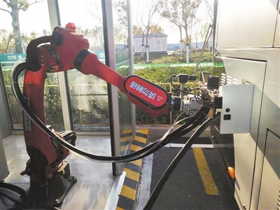 在中新友好图书馆公交站,充电机器人准确识别无人公交车停靠,自动完成插枪、充电、拔枪全过程。