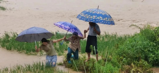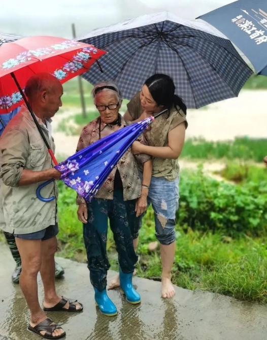 雨越下越大,水位上涨很快,道路被洪水淹没,根本分不清哪里是田地,哪里是道路,汪爱琴和一位热心村民搀扶着水花婆婆慢慢移动出来。