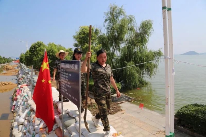 在庐山市南康镇的堤坝上,庐山市妇联主席查琴、庐山市妇联副主席于金枝、庐山市星子镇幸福村妇联主席陈阳平等妇联干部不间断巡视。一级响应后,查琴、于金枝、陈阳平三人每天要在800米堤防上来回很多趟。