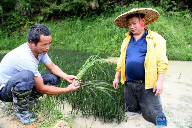 杨卓林(左)在贵州省榕江县仁里乡太元村秧田里向群众介绍黑米秧苗和其他秧苗的区别。新华社发(王炳真 摄)