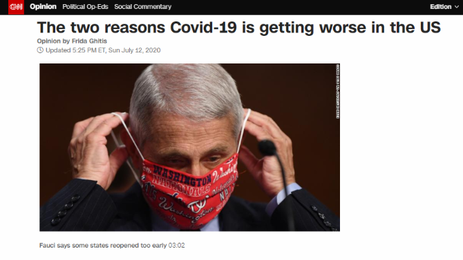 CNN一篇标题为《新冠疫情在美国恶化的两个原因》的文章发出了灵魂拷问,为什么欧洲、加拿大、新西兰以及其他国家都能让疫情得到缓解,而美国不能?