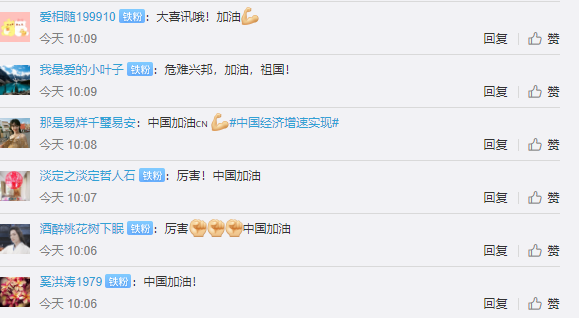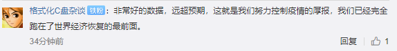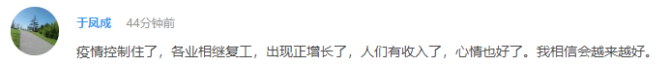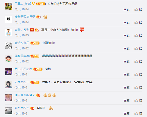 网友表示,数据表明中国经济打不垮,有很强的韧性和战略纵深。也有细心的网友反映,最近市场繁荣不少,发现公路上拉煤车,拉货车不少。还有网友说,疫情控制住了,各业相继复工,出现正增长了,人们有收入了,心情也好了。我相信会越来越好。