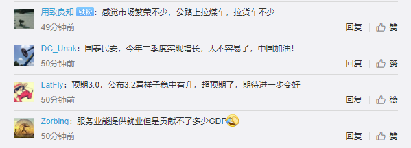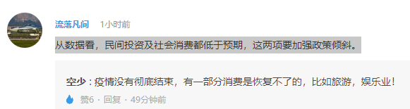 有网友建议,经济尚未完全恢复,旅游业才起步,餐饮服务业经营恢复七、八成,产业链上下游还待对接。也有网友说,从数据看,民间投资及社会消费都低于预期,这两项要加强政策倾斜。还有网友提出,GDP数据转正后,希望进一步提高经济发展的质量。