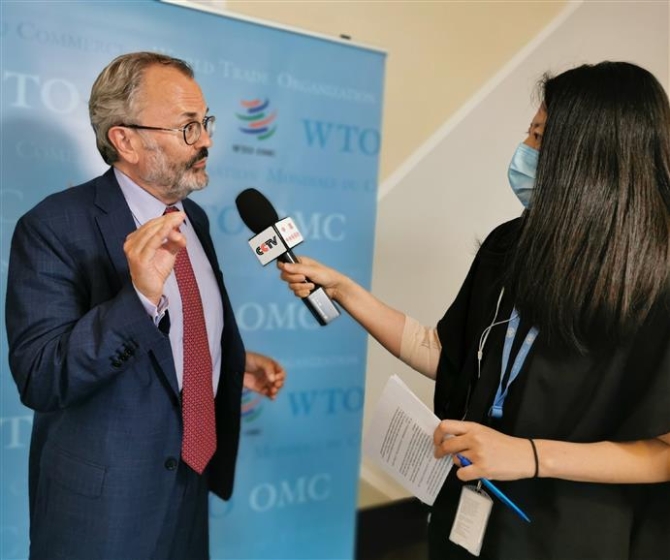 △7月15日,世界贸易组织发言人基思·罗克韦尔接受总台记者专访