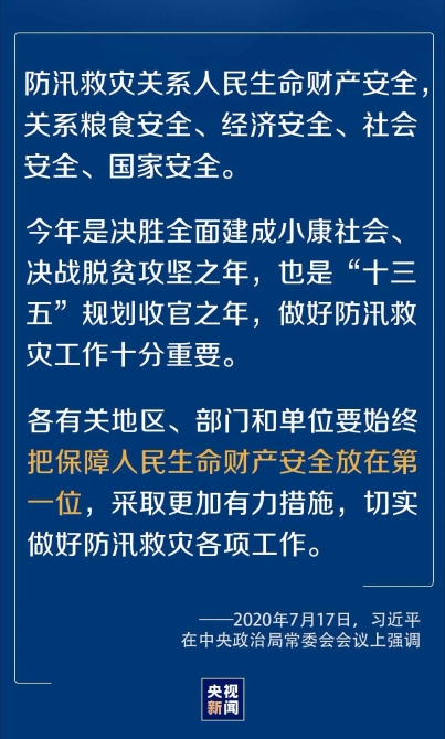 党中央高度重视今年的防汛救灾工作,5月19日,习近平在主持中央政治局常委会会议研究有关工作时,要求有关方面高度重视今年汛期长江中下游汛情,压实防汛工作责任,克服疫情影响,抢抓水利工程修复,加强物资储备,组织开展抢险培训和演习,全力保障人民生命财产安全。