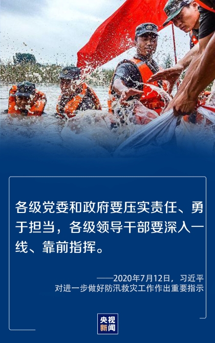 7月12日,习近平对进一步做好防汛救灾工作作出重要指示指出,各级党委和政府要压实责任、勇于担当,各级领导干部要深入一线、靠前指挥,组织广大干部群众,采取更加有力有效的措施,切实做好监测预警、堤库排查、应急处置、受灾群众安置等各项工作,全力抢险救援,尽最大努力保障人民群众生命财产安全。