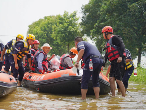 7月13日,应急管理部紧急调派浙江、安徽、福建、湖北、湖南五省消防救援总队的1000名抗洪抢险、水域救援、地质灾害救援等消防救援指战员,迅速集结,火速驰援鄱阳湖抗洪抢险一线。