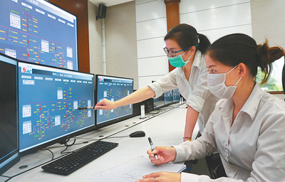在老挝南欧江梯级水电站集控中心,中老两国员工监测发电站设备运行,进行电力和水情管理。