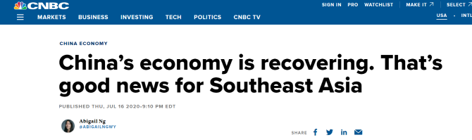 美国消费者新闻与商业频道(CNBC)17日发表文章,题为《中国经济正在复苏,这对东南亚是个好消息》。文中指出,作为东盟出口商品最多的国家,中国经济稳步增长成为东南亚国家“关键资产”。“尽管还有许多挑战,这一增长重新点燃了中国经济可以帮助其他国家复苏的希望”,华侨银行(OCBC Bank)经济学家维兰托(Wellian Wiranto)16日表示。