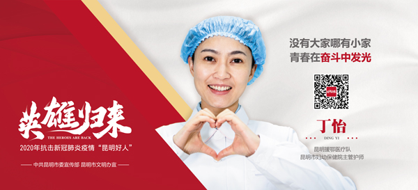 当丁怡报名参与援助湖北医疗救援队的时候,她所在的医院领导考虑其丈夫是云南省公安厅民用机场的一名民警,身处在抗疫一线,已经20多天没回家了,且考虑到家中孩子还小,未同意她的请求,但她坚决请求领导能让她去,她也坚信她的丈夫作为一名人民警察一定会支持她的选择,她们夫妻俩果断把孩子交给老人看护,即使深知存在感染的风险,为了患者的生命安全,执着于救死扶伤的初心,只为贡献出一份属于自己的光和热,成为昆明市第一批驰援湖北咸宁医疗队队员,与同事们奋战在一线。