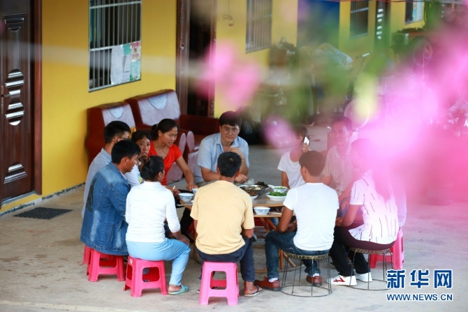 马鞍山村民在新房子下吃饭(6月12日摄)。新华网 赵普凡/摄