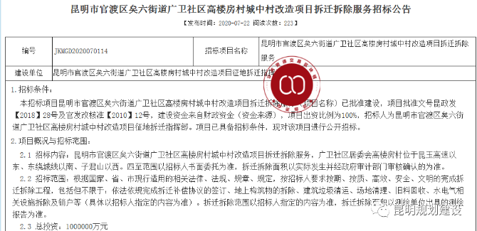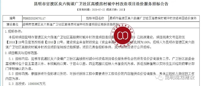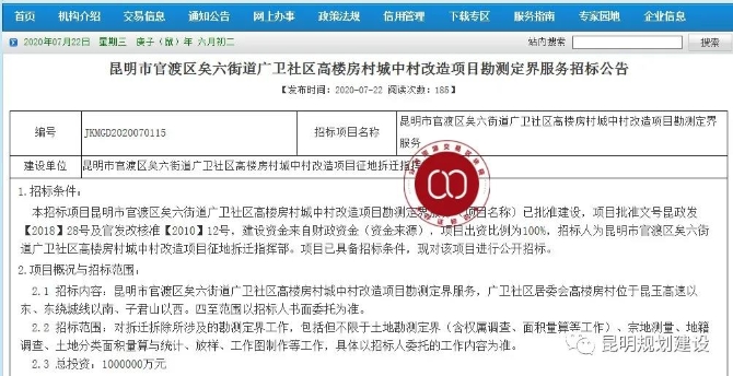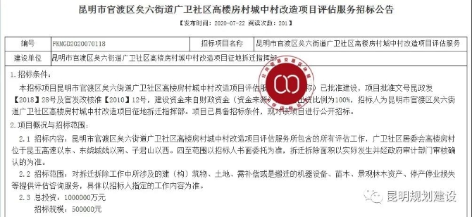 22日,昆明市公共资源交易中心发布了“昆明市官渡区矣六街道广卫社区高楼房村城中村改造项目拆迁拆除服务、项目勘测定界服务、项目测绘服务、项目造价服务、项目评估服务招标公告”,一共涉及5个招标公告宣布将启动官渡区高楼房村城中村改造。