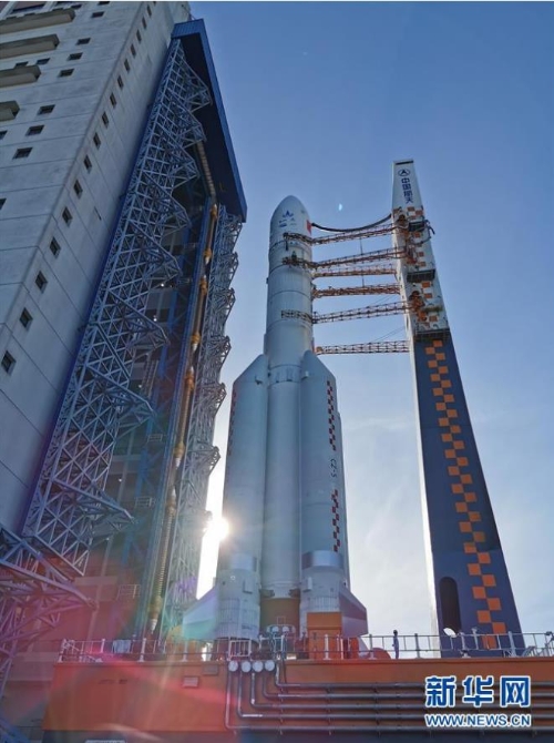 △7月17日,中国文昌航天发射场,长征五号遥四运载火箭待命。(新华社发,张高翔摄)