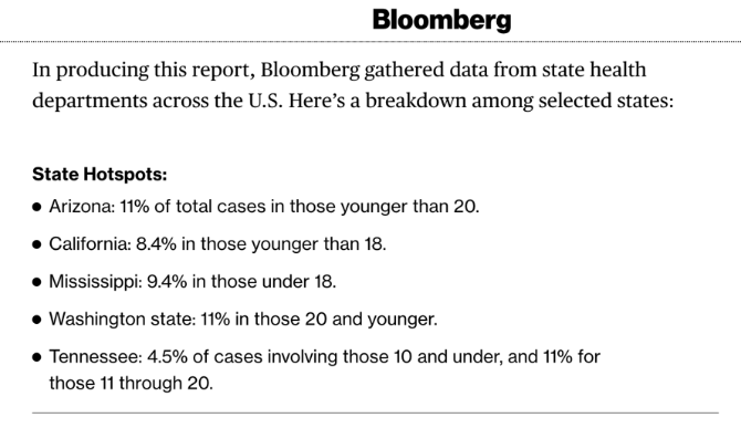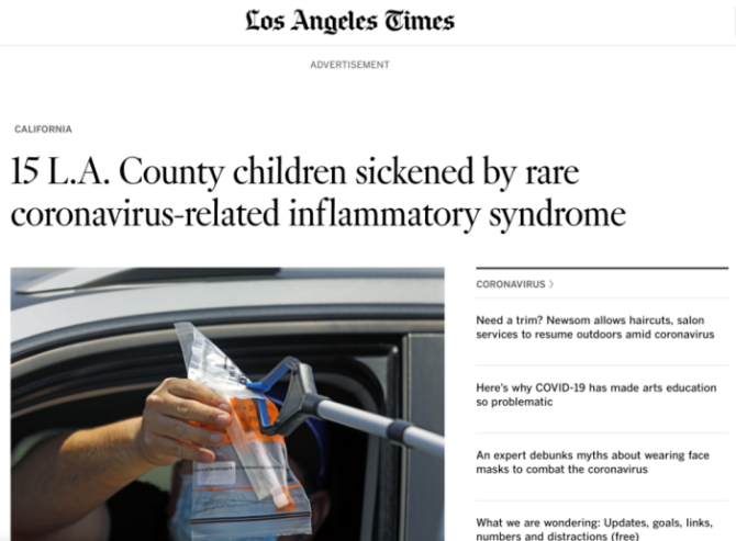 △《洛杉矶时报》称,洛杉矶县15名儿童确诊与新冠病毒有关的疾病