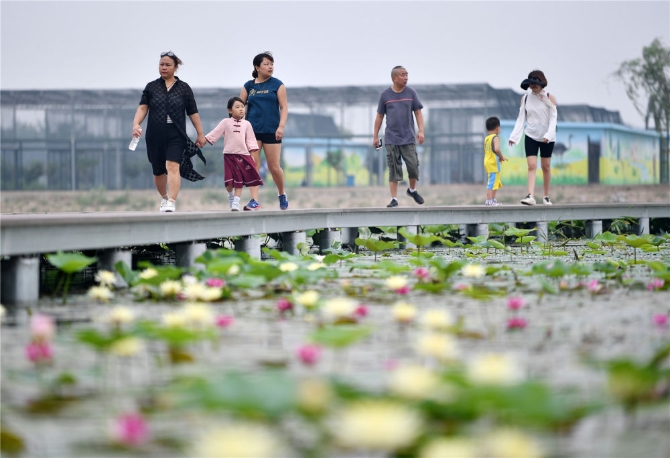 新华社天津7月23日电(记者白佳丽)锦鲤浅游,荷叶轻摆,湖光潋滟。7月中旬的周末,天津北辰区西堤头镇赵庄子村的曙光水镇里游客往来不绝,一场户外音乐节掀起了夏日“热浪”。
