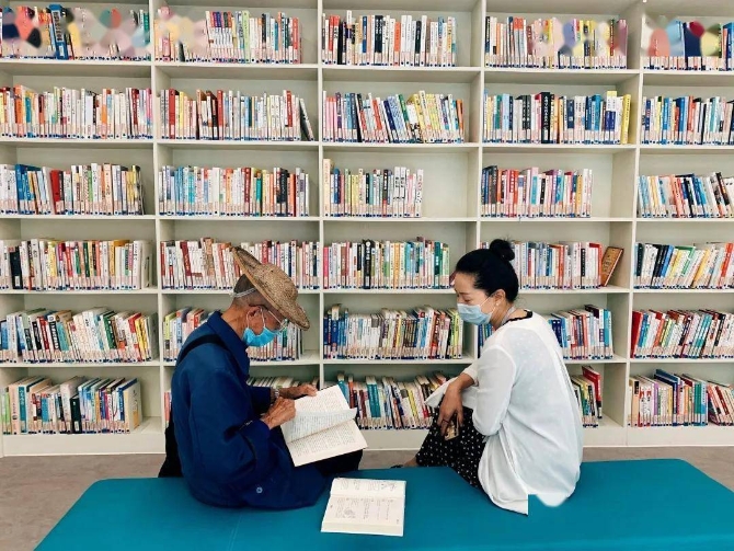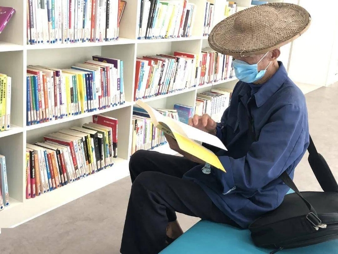 老人坐一旁看书。丽水市图书馆提供