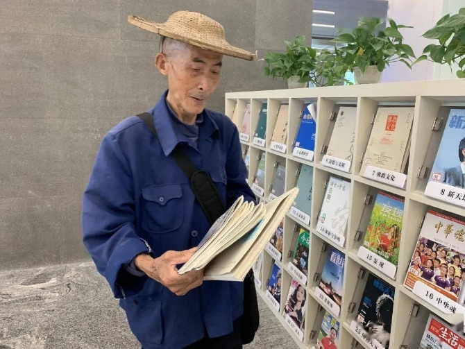 7月20日,浙江丽水市图书馆馆长季彤曦在朋友圈晒出一位读者的照片。那是一位戴着斗笠、身穿蓝色旧外套的老人,手上拿着十多本期刊,在工作人员的帮助下往包里塞。