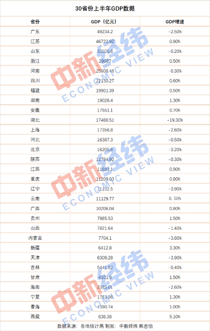 截至7月25日,除黑龙江之外,全国30省份披露2020年上半年地区生产总值,广东、江苏、山东3省份稳居前三,16省份增速为正,优于-1.6%的全国水平。