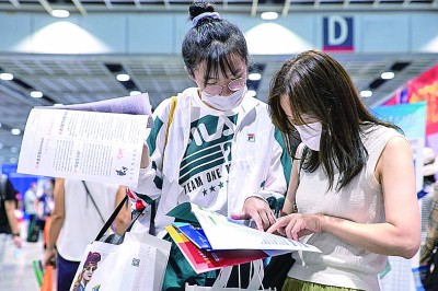 7月25日,考生和家长在江苏省2020年高考考生职业生涯指导与志愿填报咨询会上了解高校招生信息。苏阳摄/光明图片