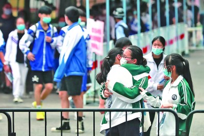 7月10日,在北京中关村中学考点,考生走出考场后相拥。新华社发