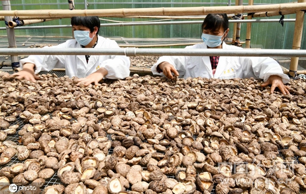 2020年5月12日,安徽省铜陵市枞阳县钱铺镇将军村特色农业产业扶贫联合体企业——枞阳县新农民农业种植有限公司里,村民在烘培香菇。(图片来源:东方IC)