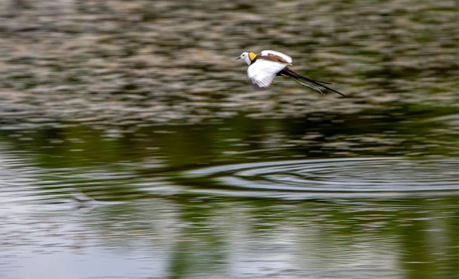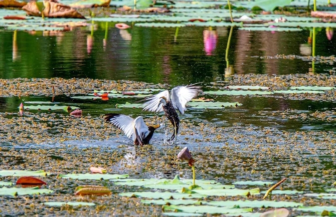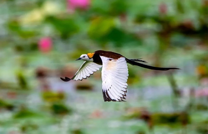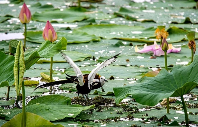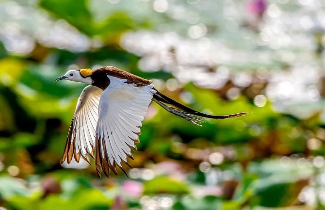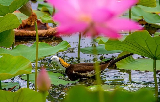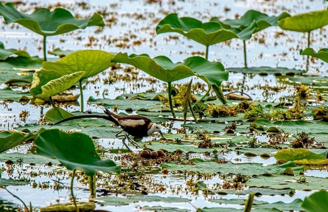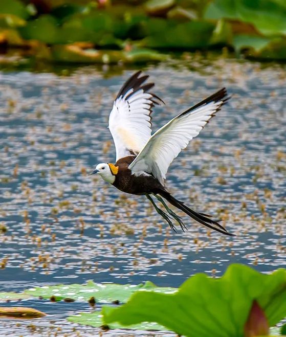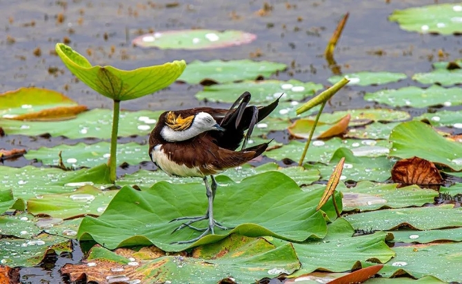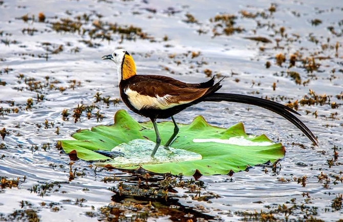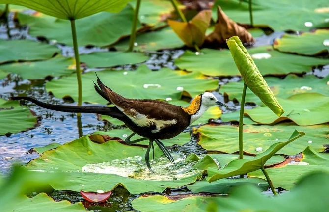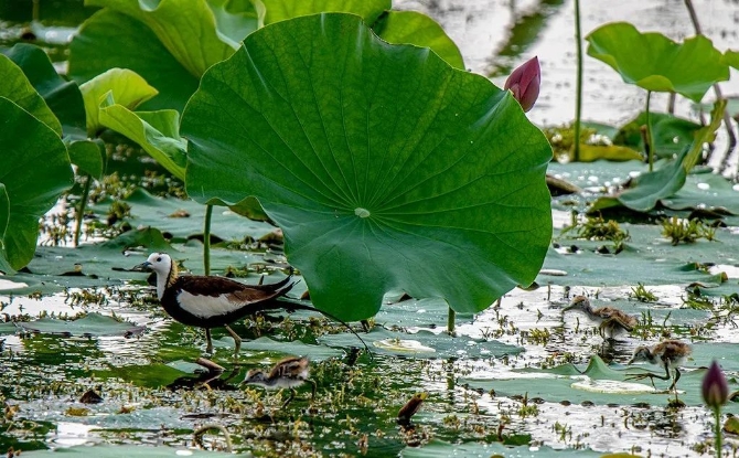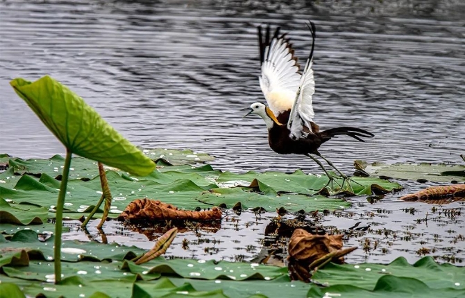 水雉是鸻形目水雉科的一种中小型鸟类。生活在热带及亚热带的开放性湿地中,主要为淡水湖沼。水雉的脚爪是比较独特的,加上体态轻盈,能轻步行走于睡莲、荷花、菱角、芡实等浮叶植物上,且体态优美,羽色艳丽,被美称为“凌波仙子”“水上凤凰”。水雉也善游泳和潜水,游泳时头尾高扬。